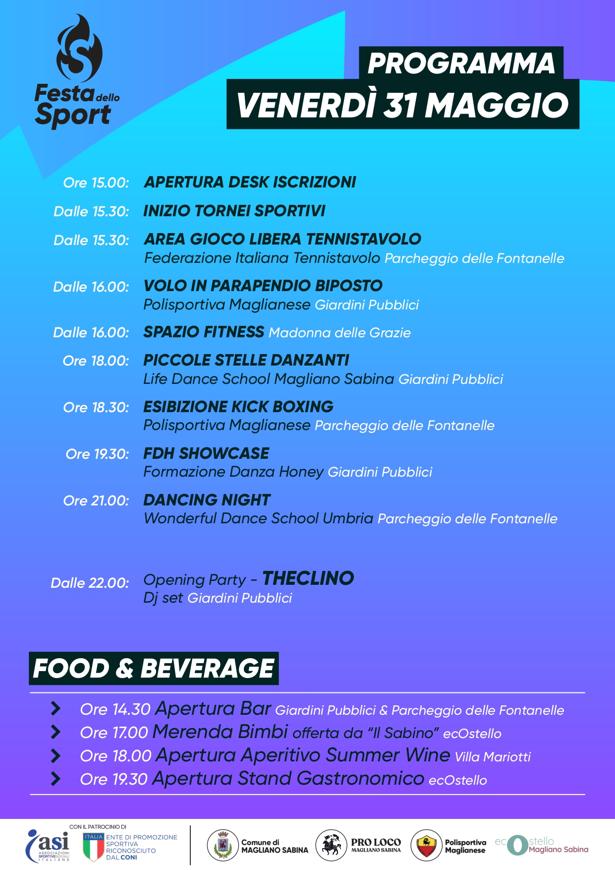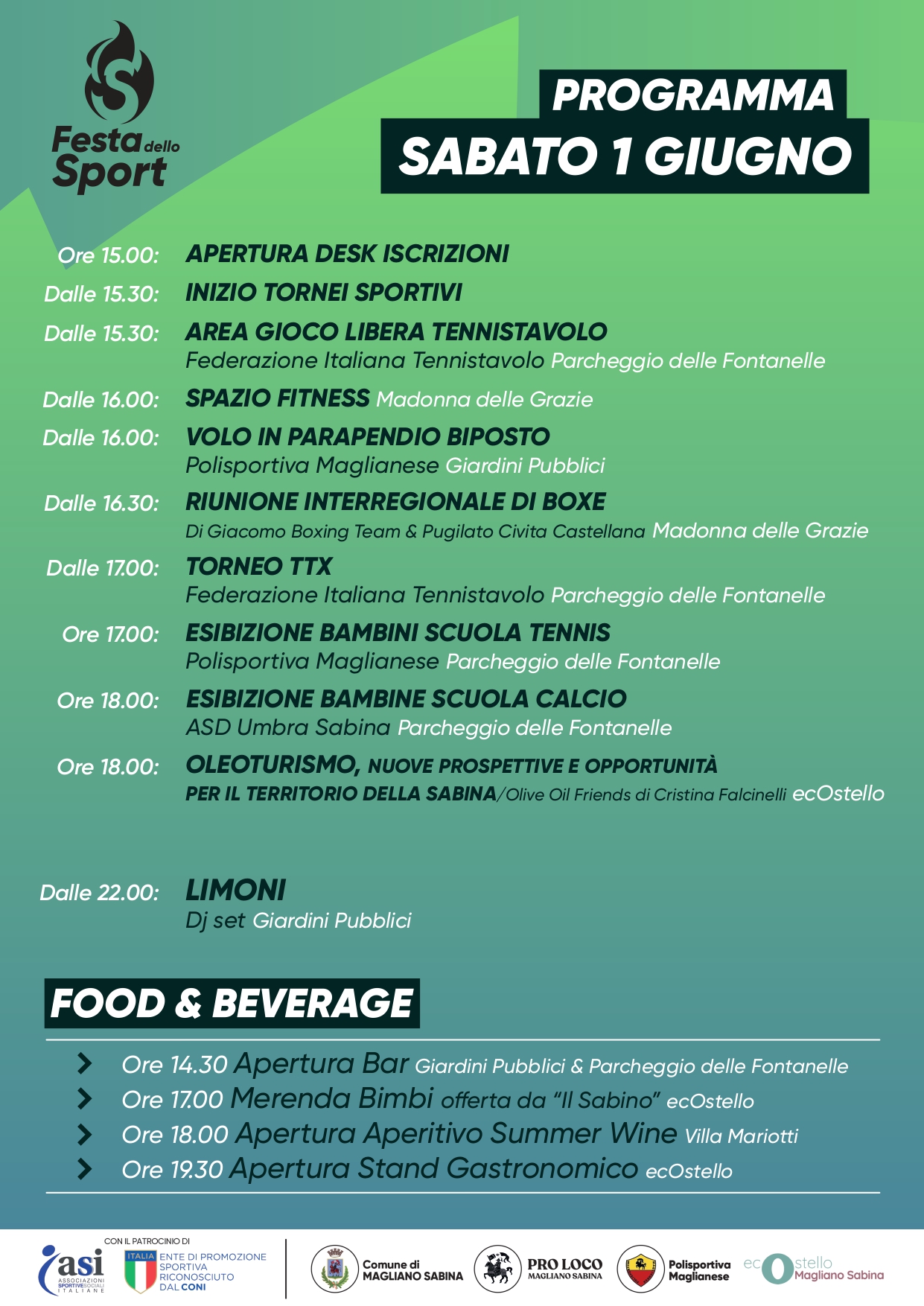 Torna la Festa dello Sport di Magliano Sabina, che nell’edizione 2024 si articola in 3 giornate secondo il seguente programma (clicca sulla prima immagine per ingrandire la galleria).
