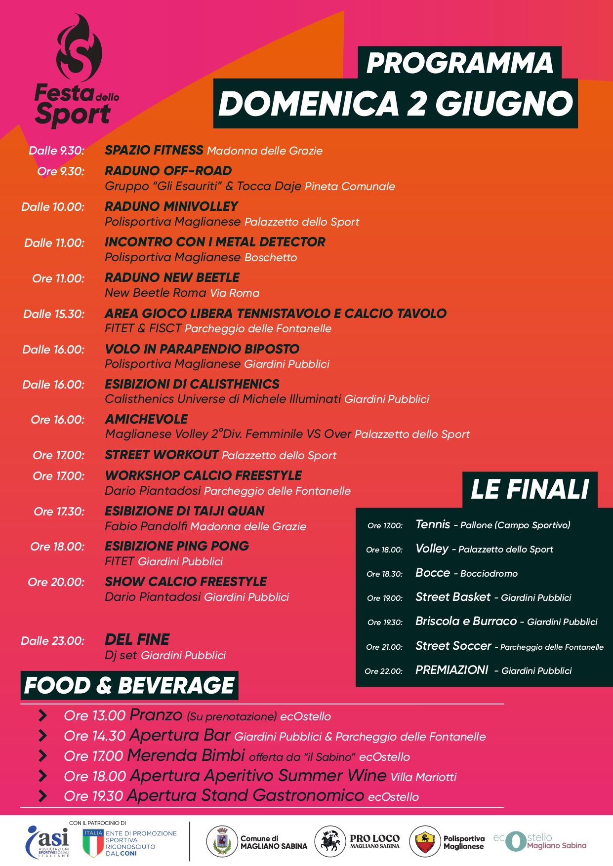 Per conoscere in dettaglio tutti i numerosissimi appuntamenti organizzati, ti consigliamo di scorrere la pagina Facebook Festa della Sport Magliano